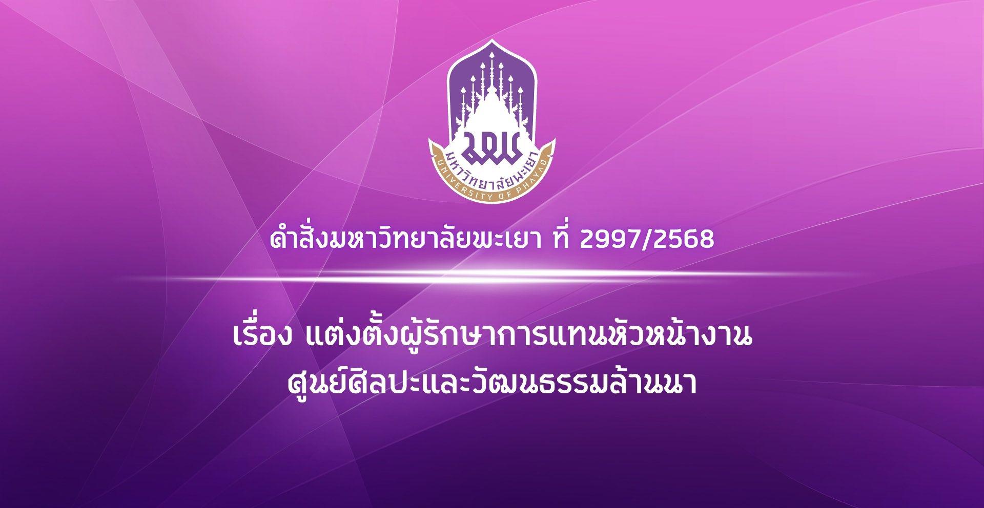 คำสั่งมหาวิทยาลัยพะเยา ที่ 2997/2568 เรื่อง แต่งตั้งผู้รักษาการแทนหัวหน้างาน ศูนย์ศิลปะและวัฒนธรรมล้านนา