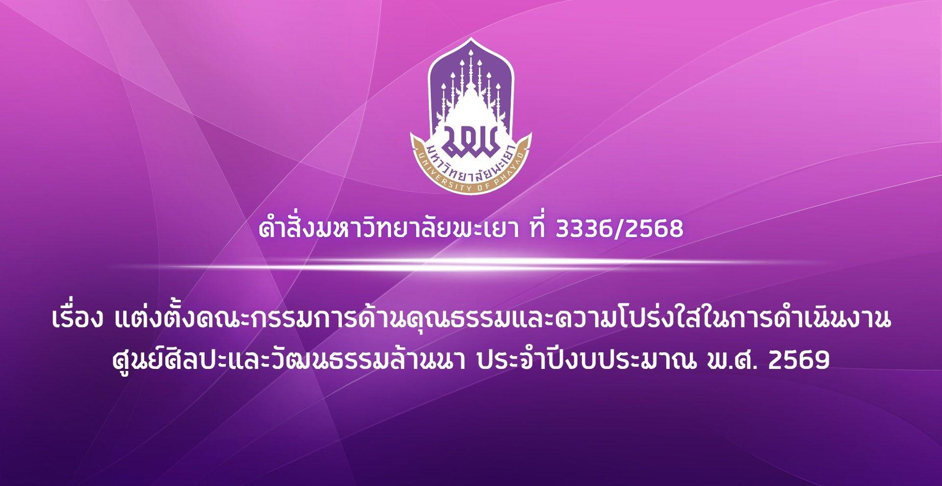 คำสั่งมหาวิทยาลัยพะเยา ที่ 3336/2568 เรื่อง แต่งตั้งคณะกรรมการด้านคุณธรรมและความโปร่งใสในการดำเนินงาน ศูนย์ศิลปะและวัฒนธ...