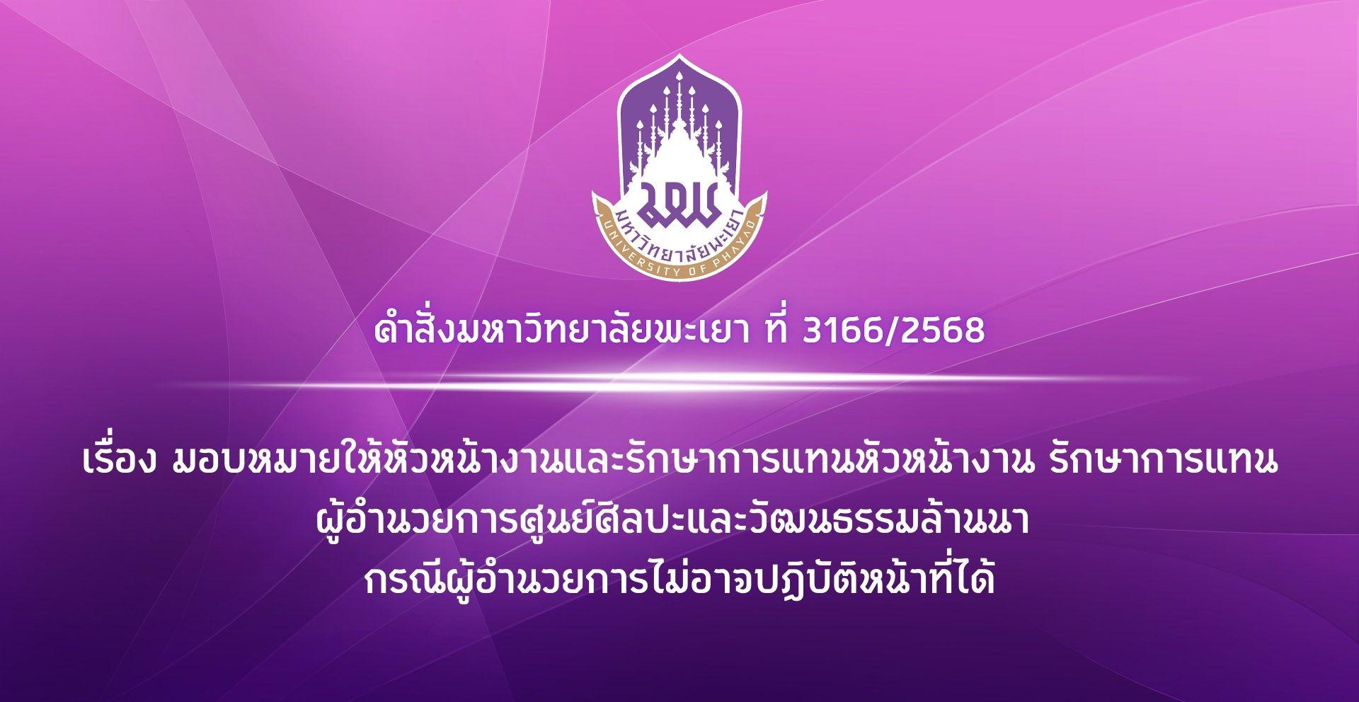 คำสั่งมหาวิทยาลัยพะเยา ที่ 3166/2568 เรื่อง มอบหมายให้หัวหน้างานและรักษาการแทนหัวหน้างาน รักษาการแทน ผู้อำนวยการศูนย์ศิล...