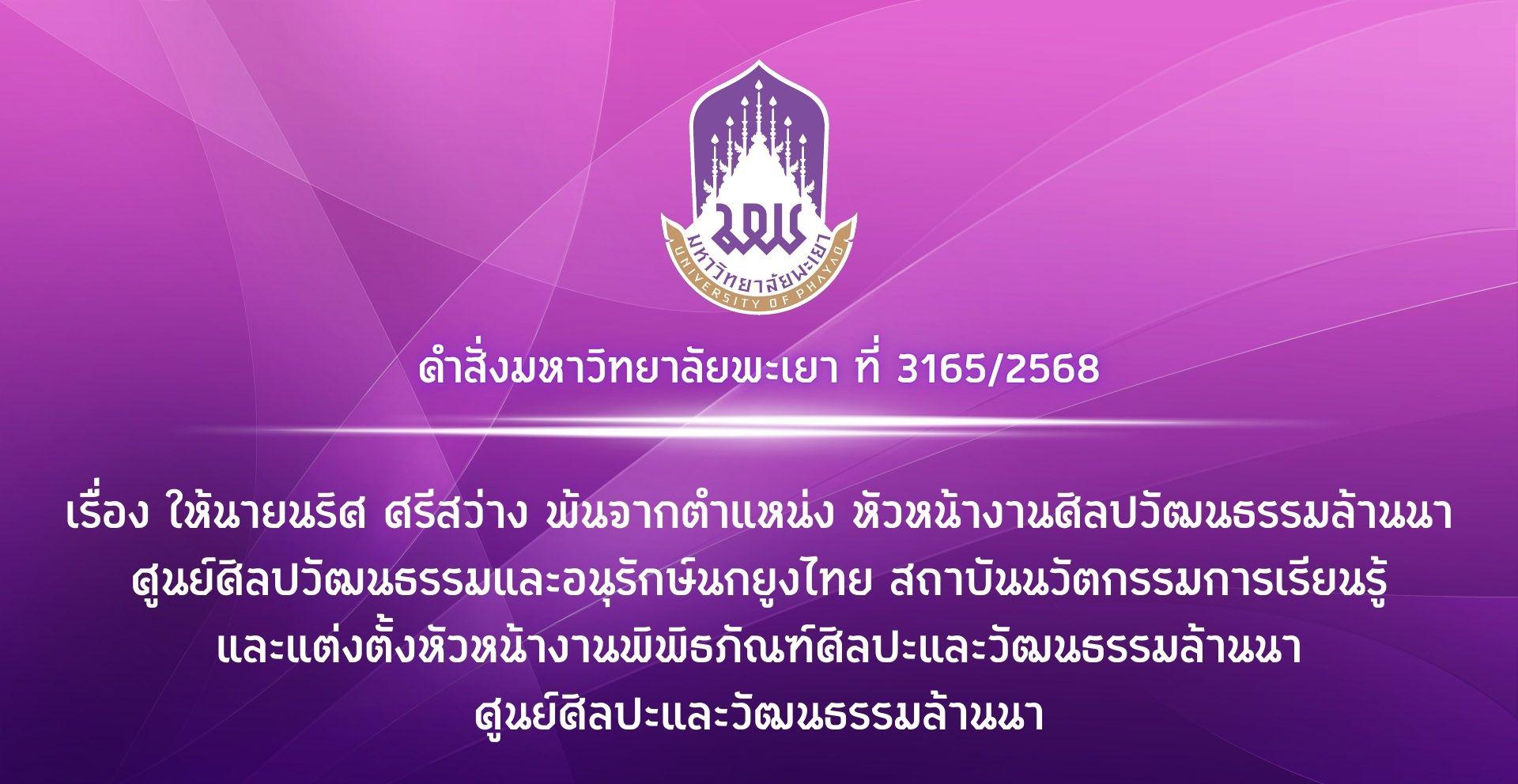 คำสั่งมหาวิทยาลัยพะเยา ที่ 3165/2568 เรื่อง ให้นายนริศ ศรีสว่าง พ้นจากตำแหน่ง หัวหน้างานศิลปวัฒนธรรมล้านนา ศูนย์ศิลปวัฒน...