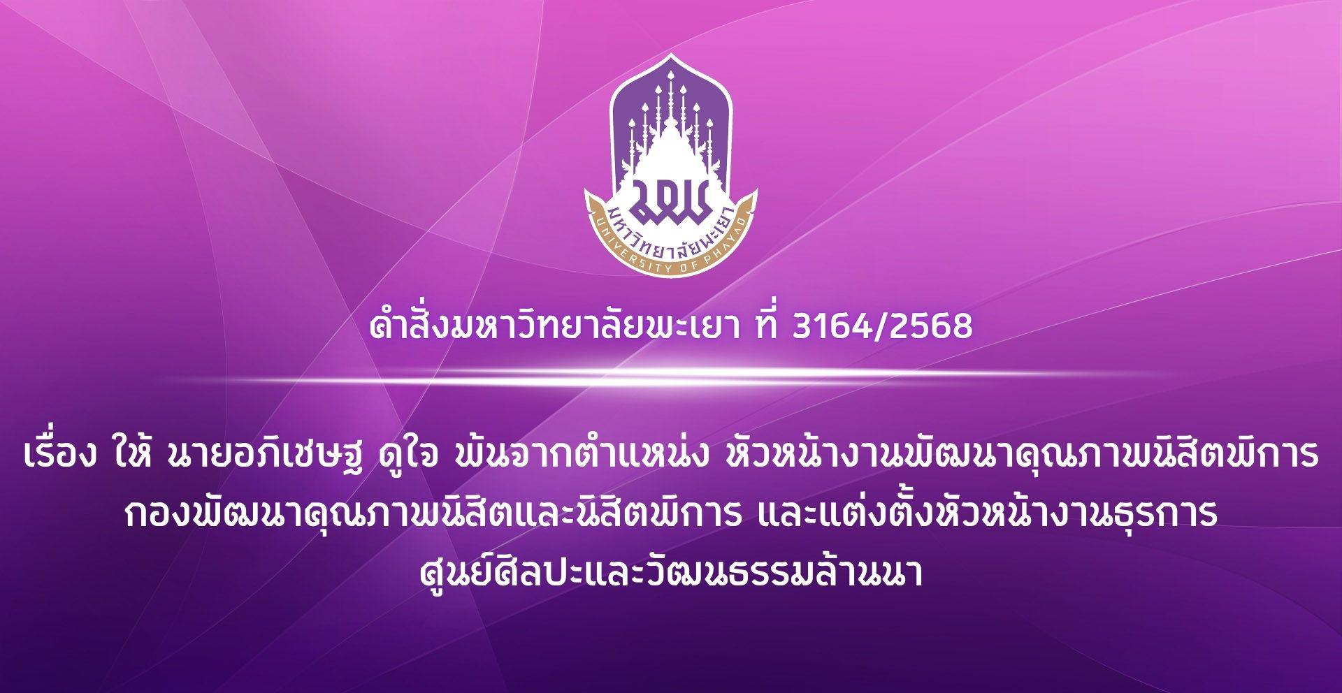 คำสั่งมหาวิทยาลัยพะเยา ที่ 3164/2568 เรื่อง ให้ นายอภิเชษฐ ดูใจ พ้นจากตำแหน่ง หัวหน้างานพัฒนาคุณภาพนิสิตพิการ กองพัฒนาคุ...
